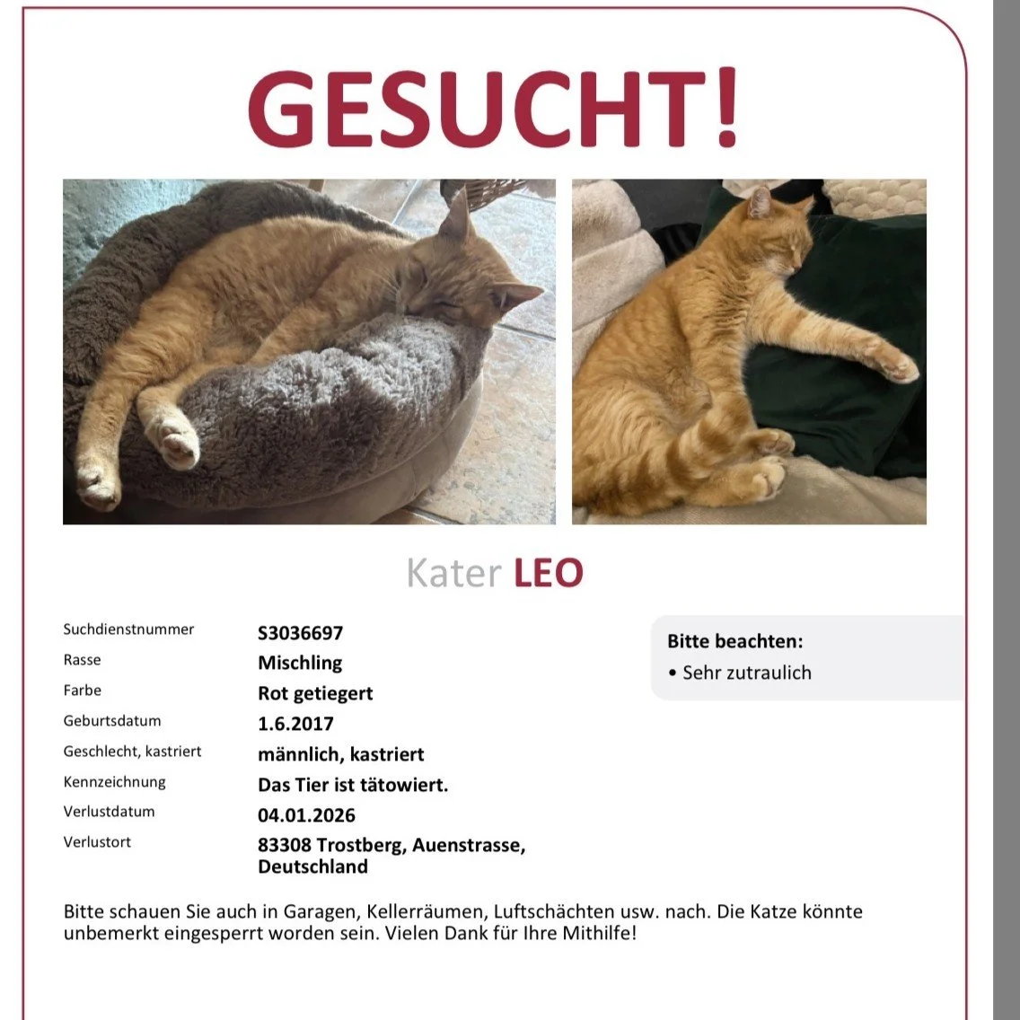 Seit 05.01.2026 wird in der Auenstraße Kater Leo vermisst.